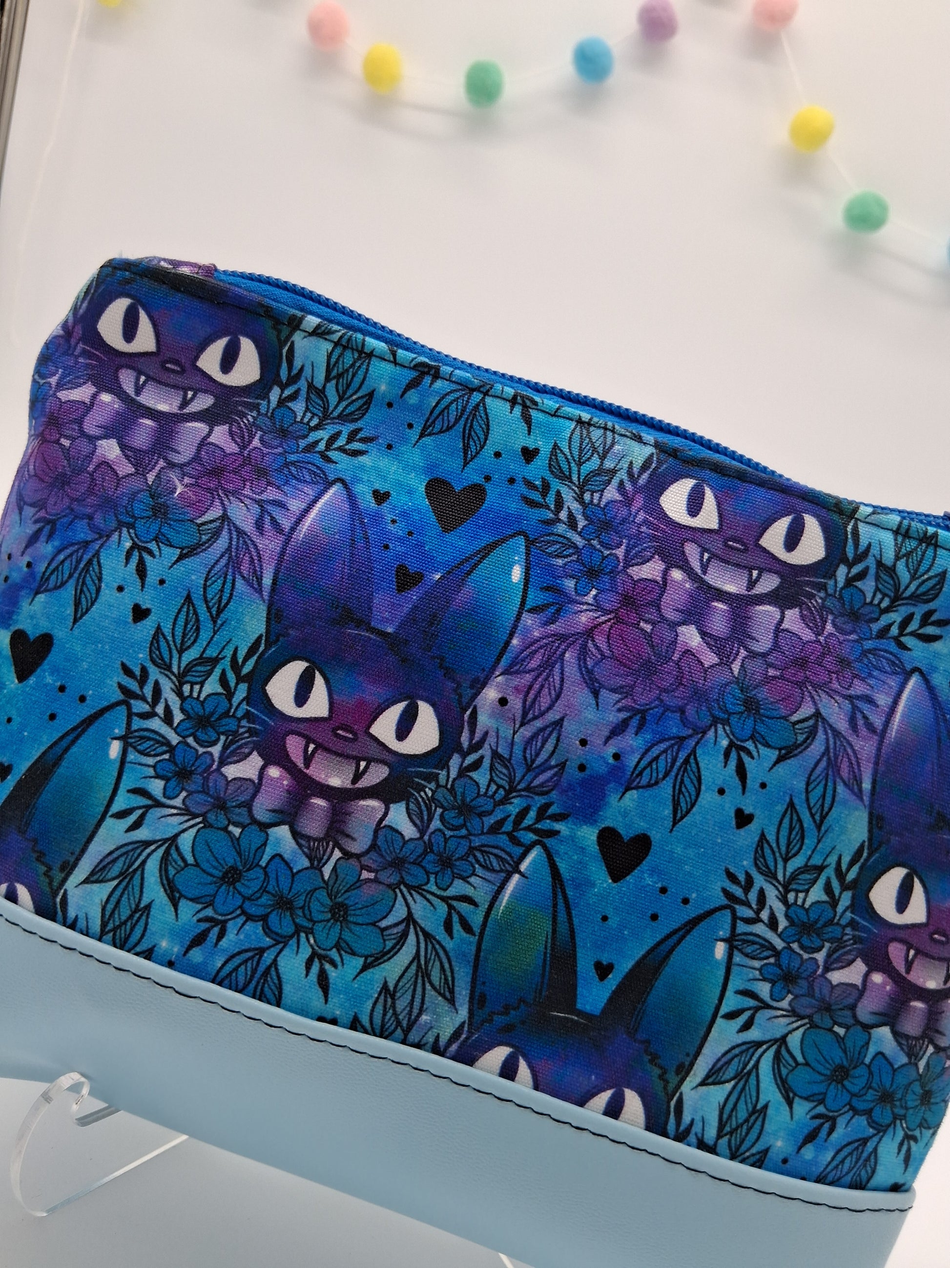 This cute little pouch has many different utilizations. The vinyl bottom gives structure to remain upright while the cotton offers enough flexibility to fit in a wide array of bags. Use it to keep your makeup safe, your office supplies together or your monthly moon supplies close by. A fitted zipper keeps it all securely inside.