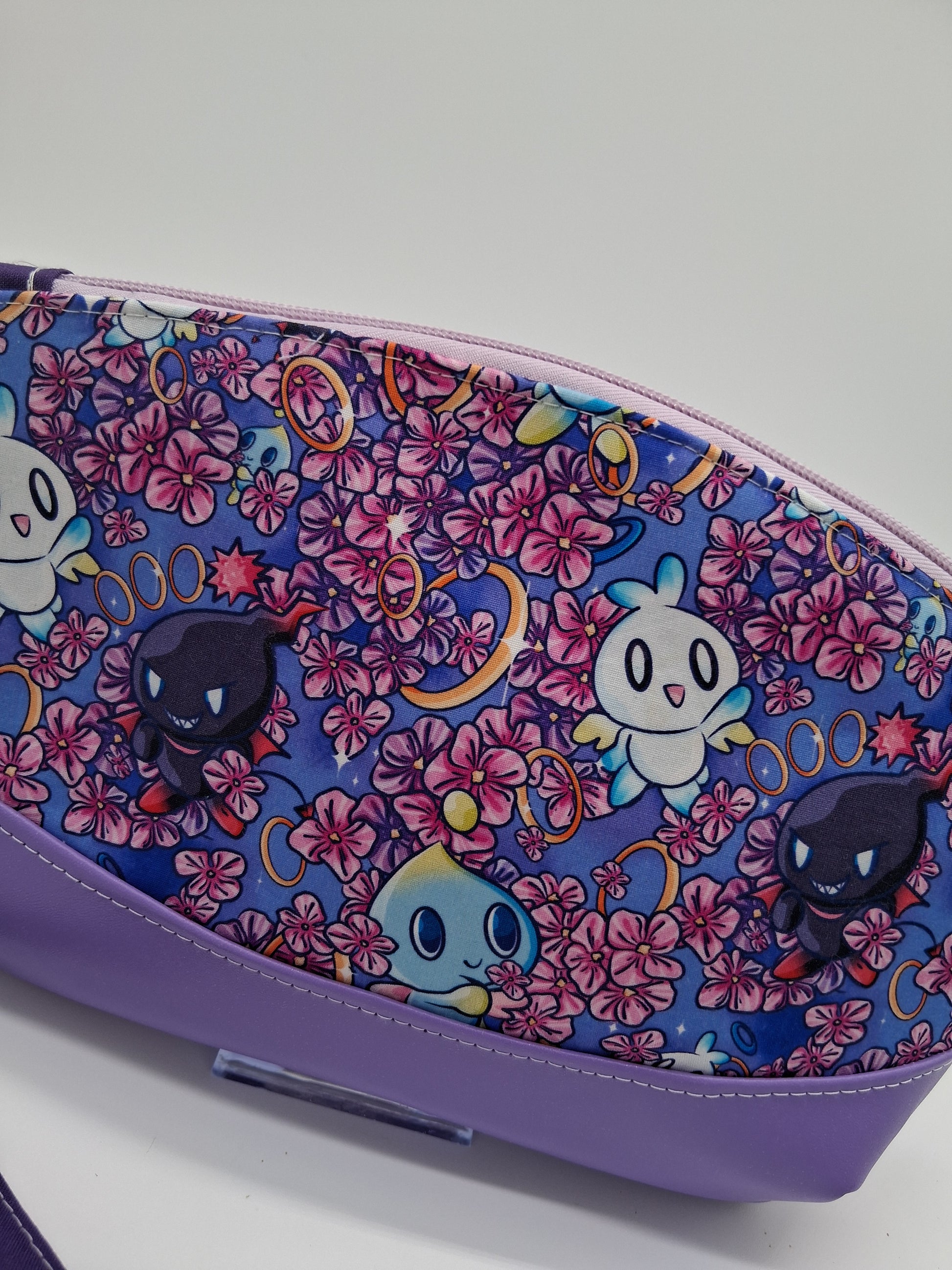 Has a lilac zipper and lilac zipper pull and is topstitched in white. Fabric is 100% custom printed cotton from a small WOC-owned business, who ethically sources and compensates artists for their work, and bottom of bag is purple vinyl for easy wipe down and to keep shape. Lining is pink and there is one baby pink interior slip pocket. Hardware includes rose gold colored nickel d ring and lobster swivel clasp.