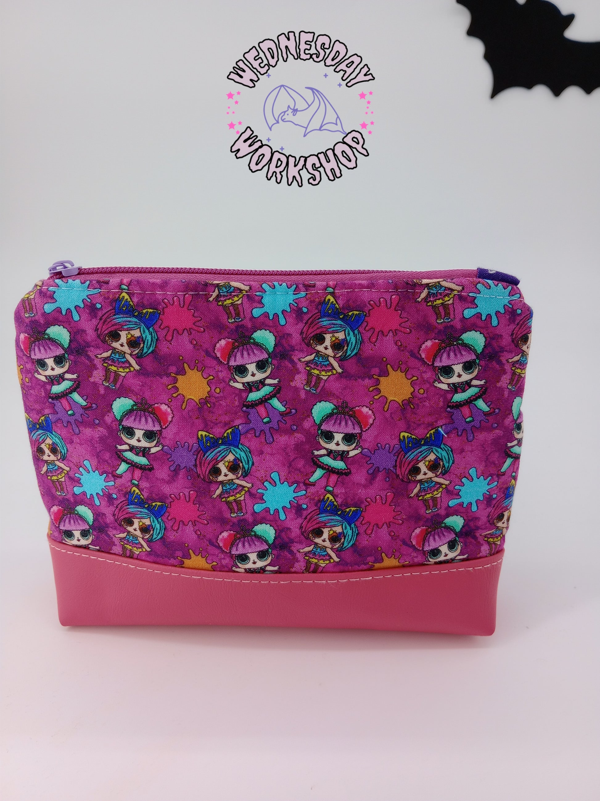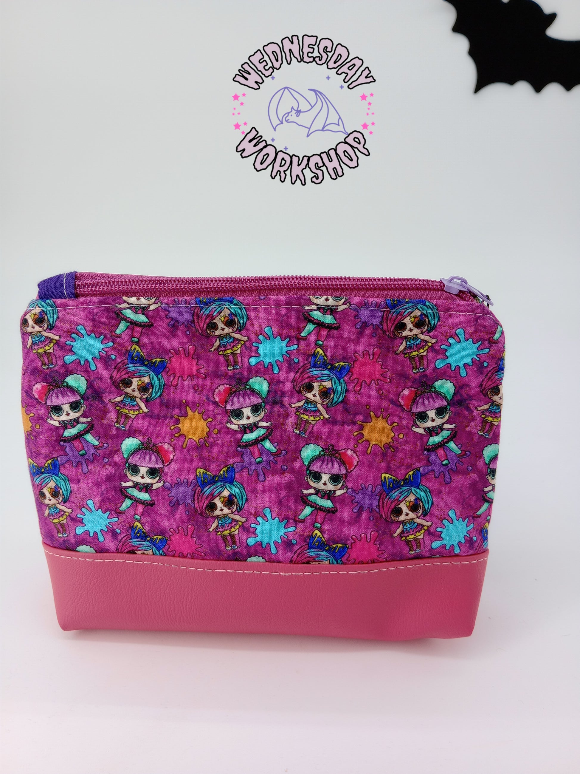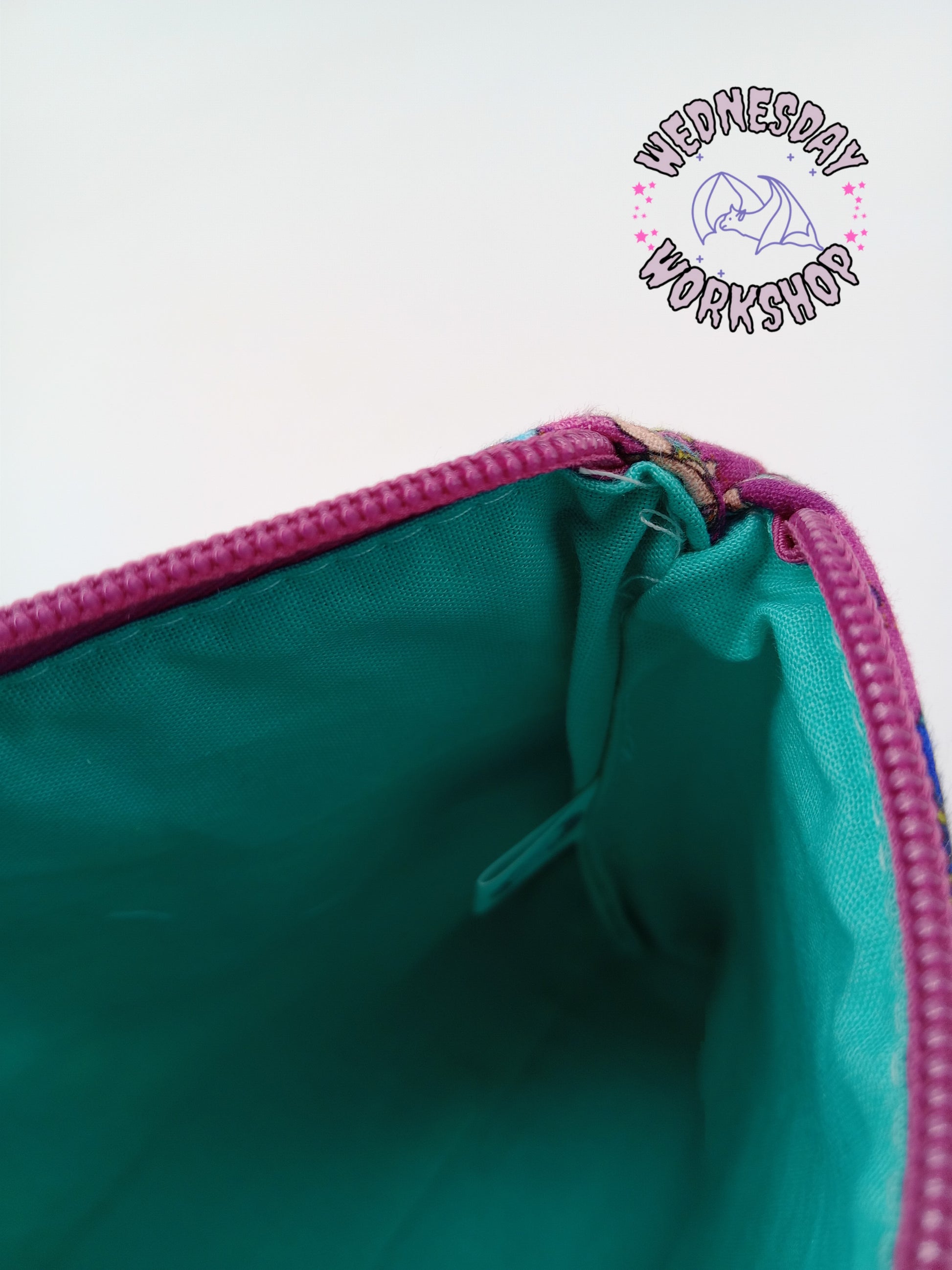 This cute little pouch has many different utilizations. The vinyl bottom gives structure to remain upright while the cotton offers enough flexibility to fit in a wide array of bags. Use it to keep your makeup safe, your office supplies together or your monthly moon supplies close by. A fitted zipper keeps it all securely inside.