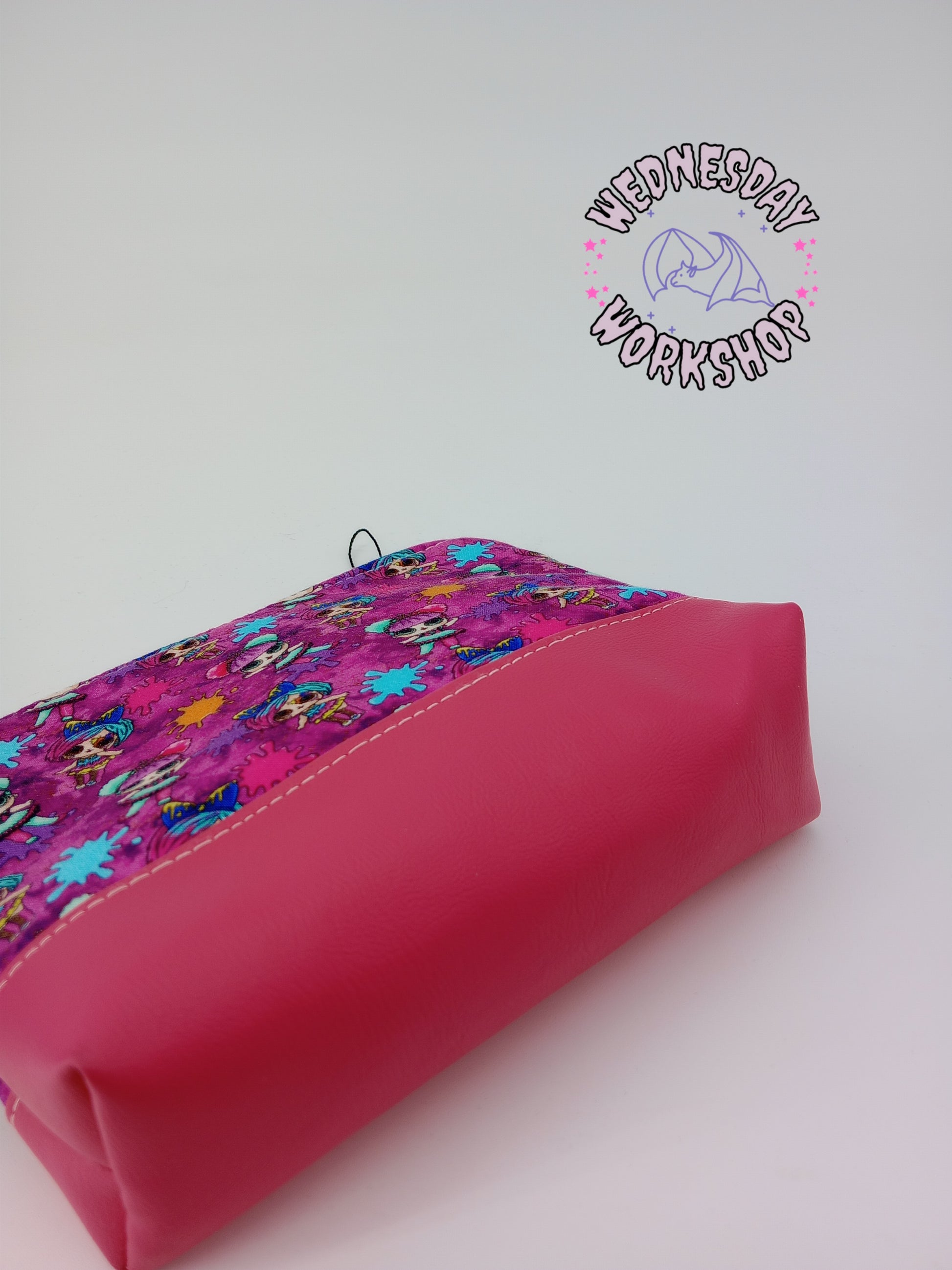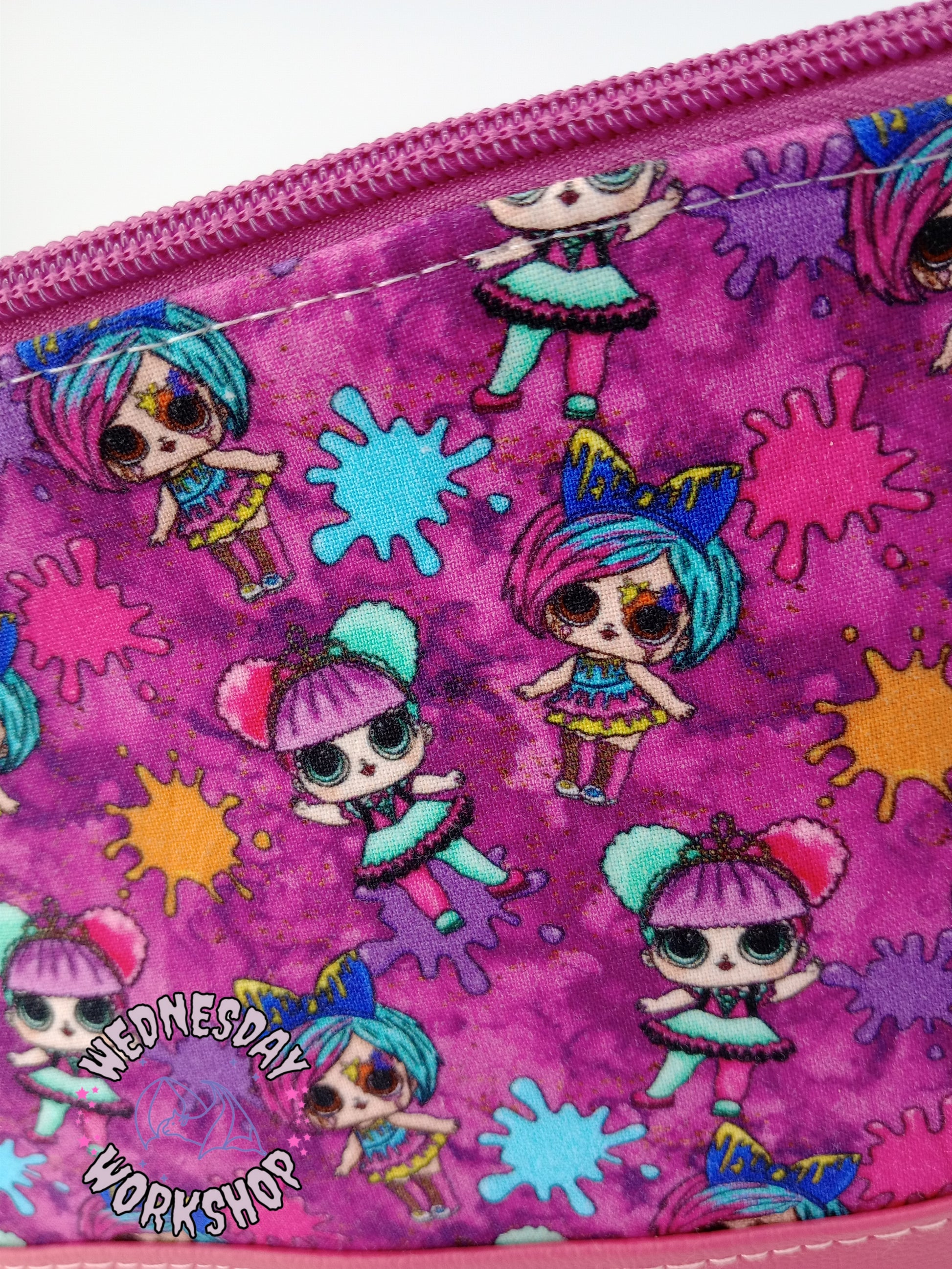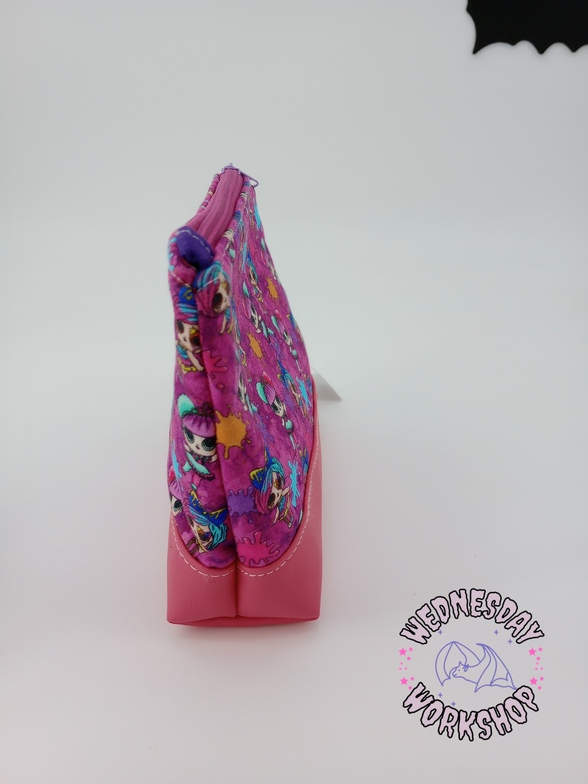 This cute little pouch has many different utilizations. The vinyl bottom gives structure to remain upright while the cotton offers enough flexibility to fit in a wide array of bags. Use it to keep your makeup safe, your office supplies together or your monthly moon supplies close by. A fitted zipper keeps it all securely inside.