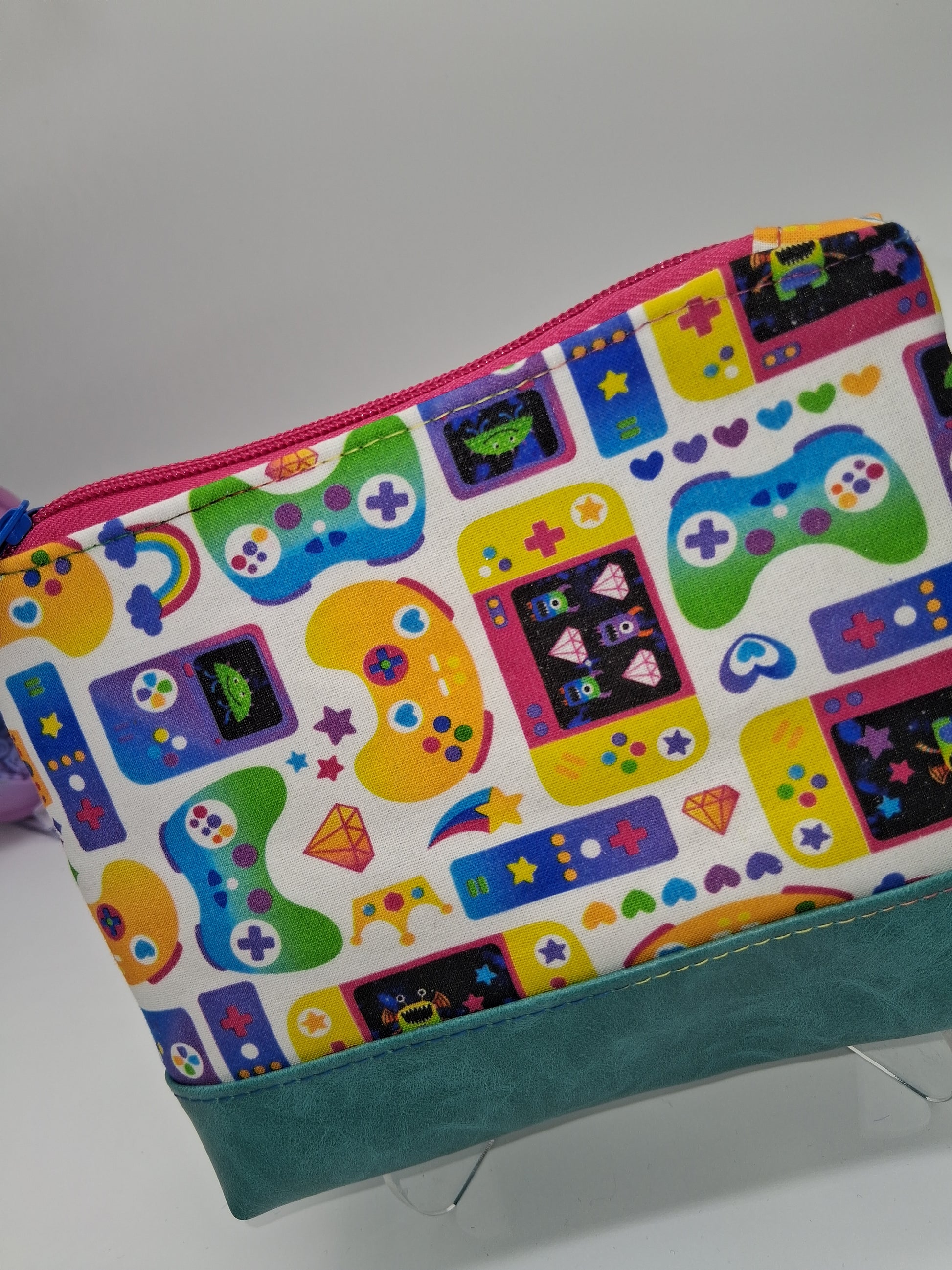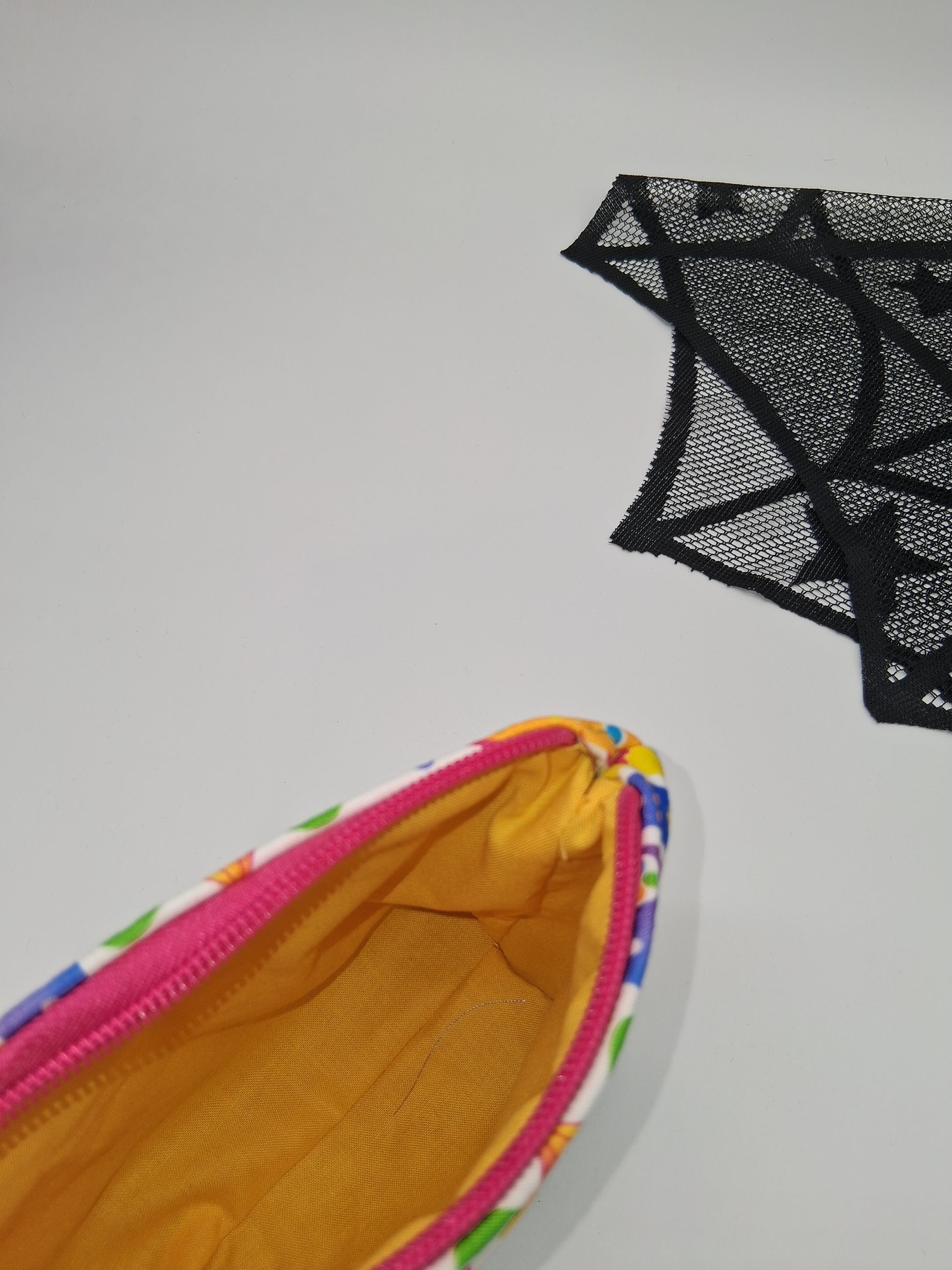 This cute little pouch has many different utilizations. The vinyl bottom gives structure to remain upright while the cotton offers enough flexibility to fit in a wide array of bags. Use it to keep your makeup safe, your office supplies together or your monthly moon supplies close by. A fitted zipper keeps it all securely inside.