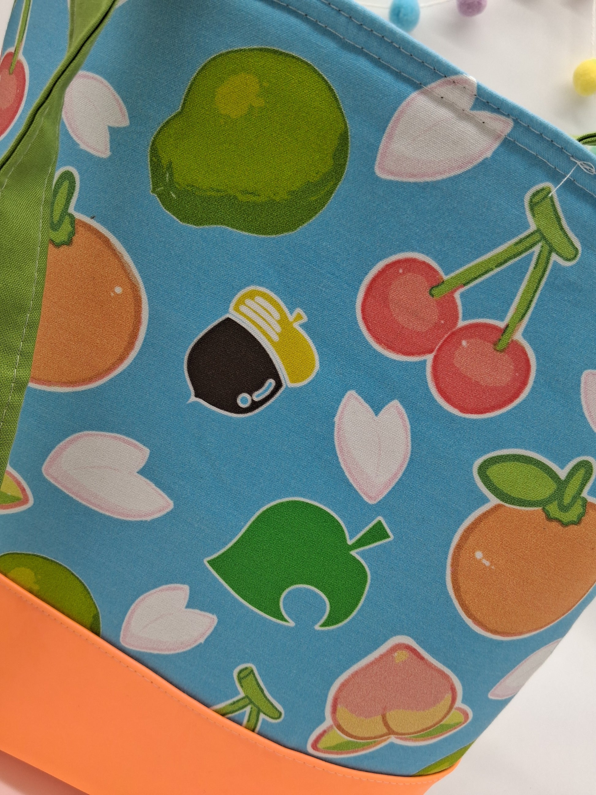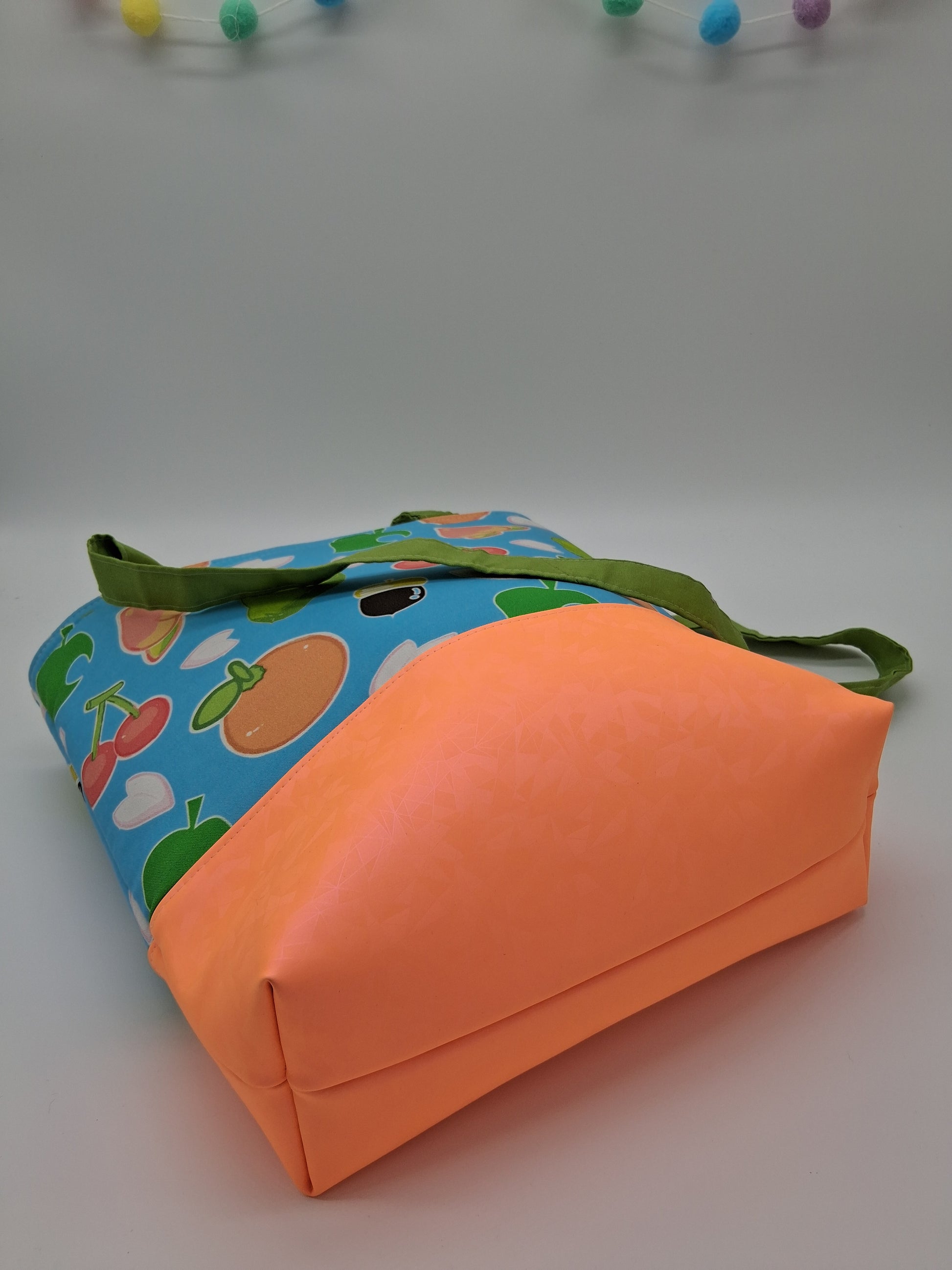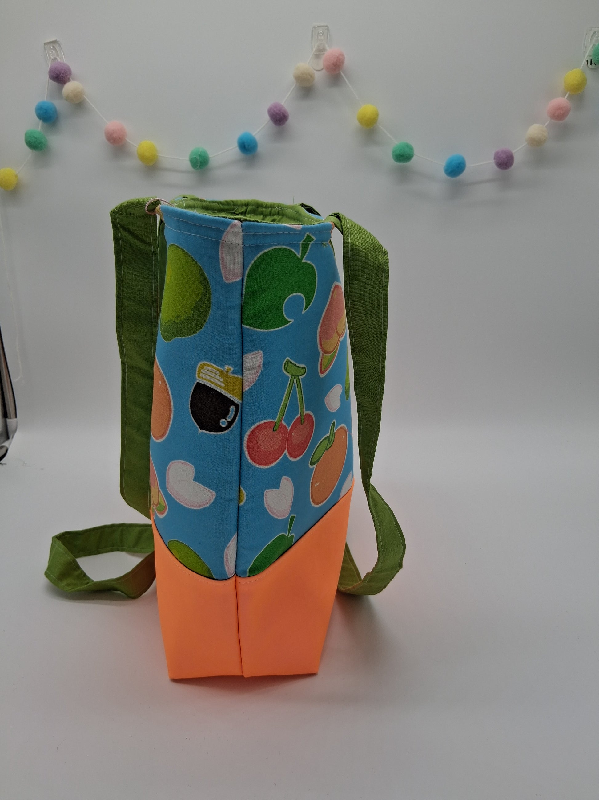 Beautiful custom 100% cotton fabric has been reinforced with soft but sturdy foam and features a vinyl bottom for easy self-standing and wiping clean. The straps are made from coordinated 100% cotton fabric as well as the lining.