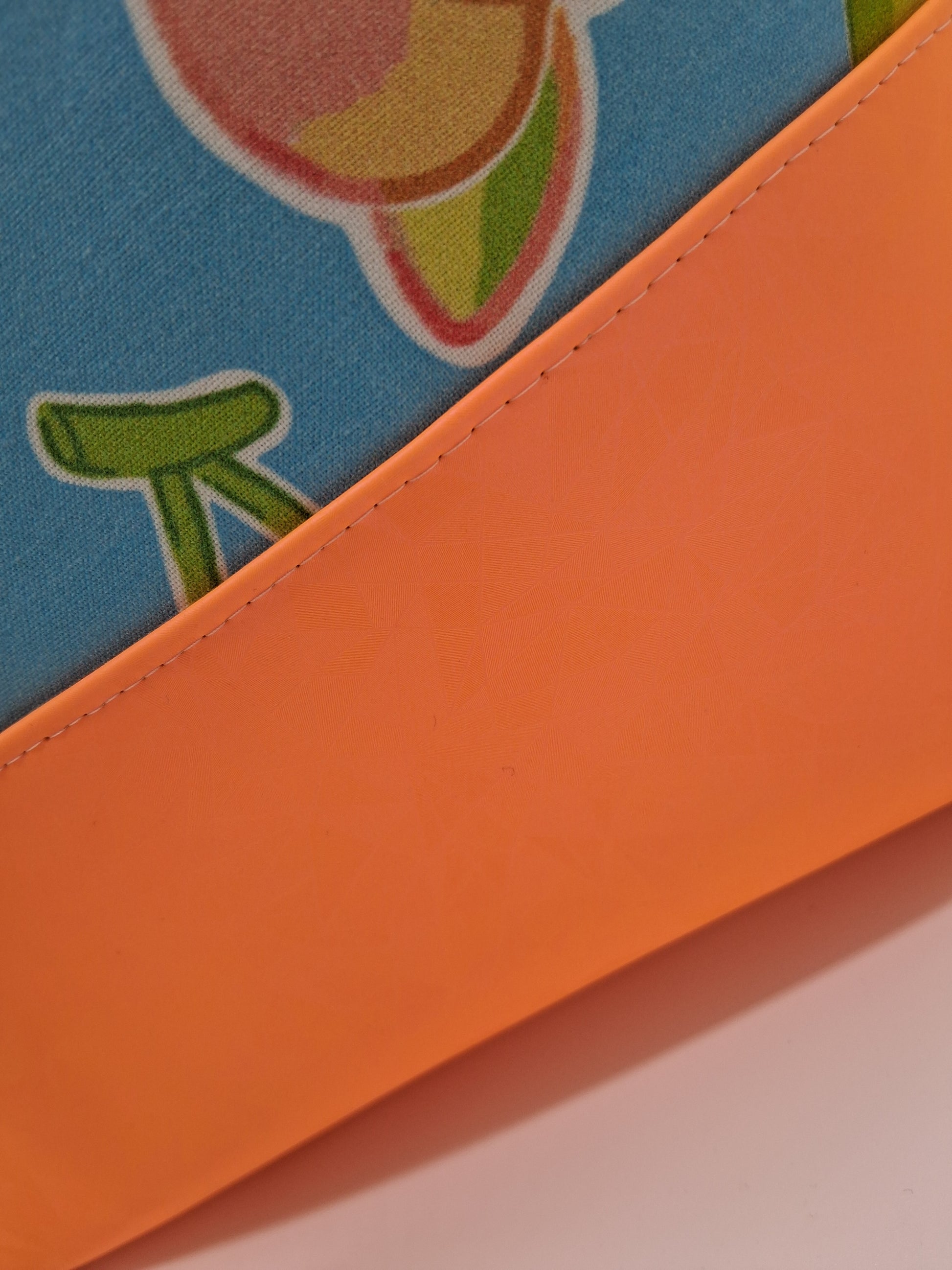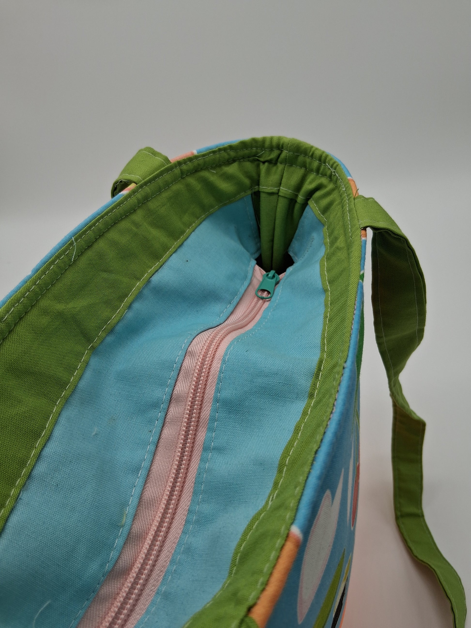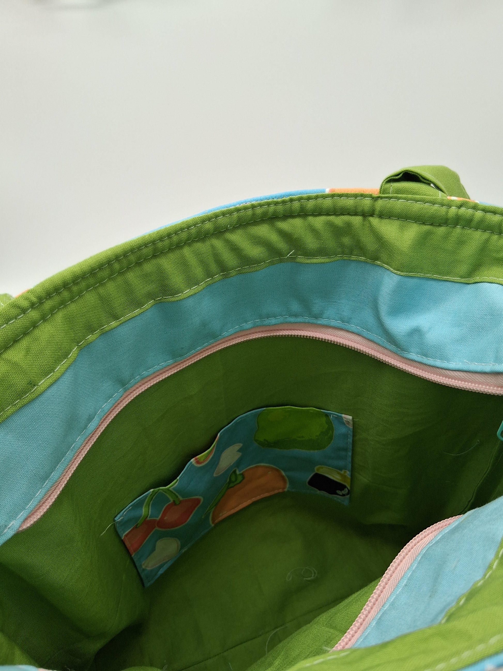 Beautiful custom 100% cotton fabric has been reinforced with soft but sturdy foam and features a vinyl bottom for easy self-standing and wiping clean. The straps are made from coordinated 100% cotton fabric as well as the lining.