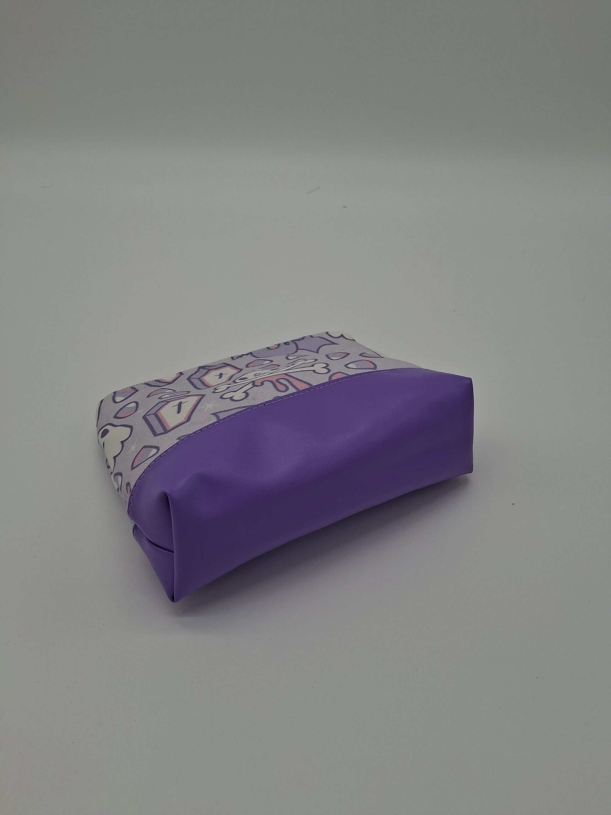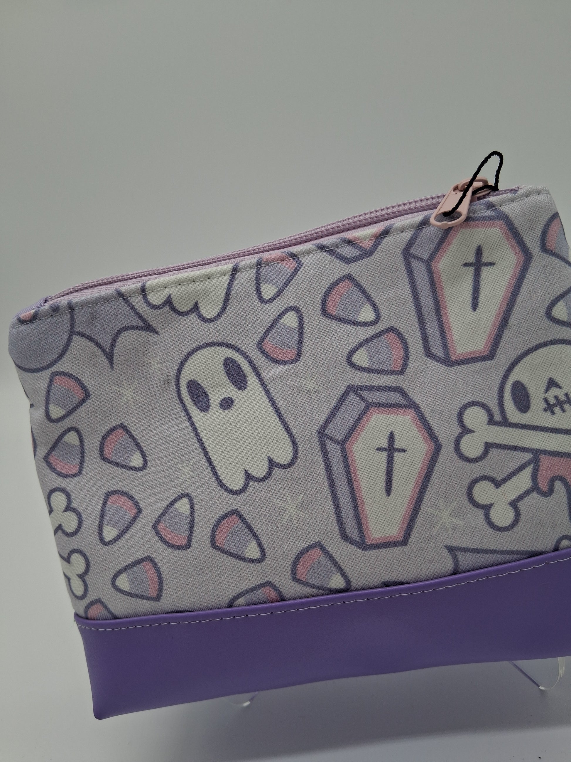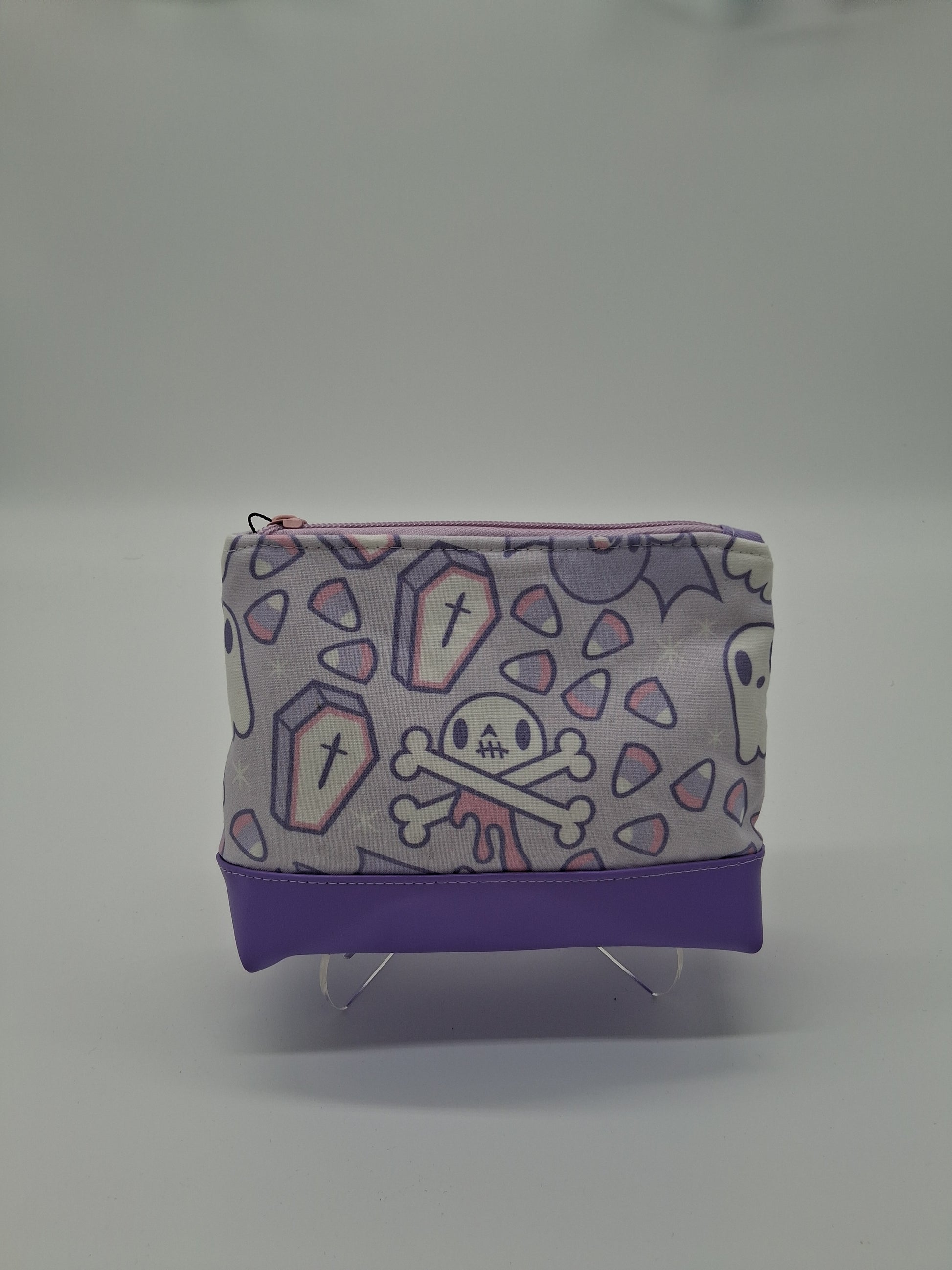 This cute little pouch has many different utilizations. The vinyl bottom gives structure to remain upright while the cotton offers enough flexibility to fit in a wide array of bags. Use it to keep your makeup safe, your office supplies together or your monthly moon supplies close by. A fitted zipper keeps it all securely inside.