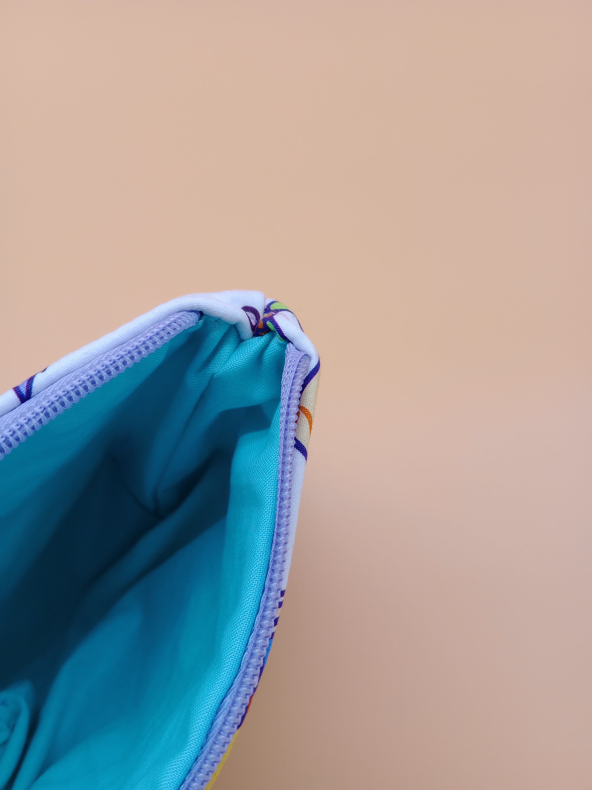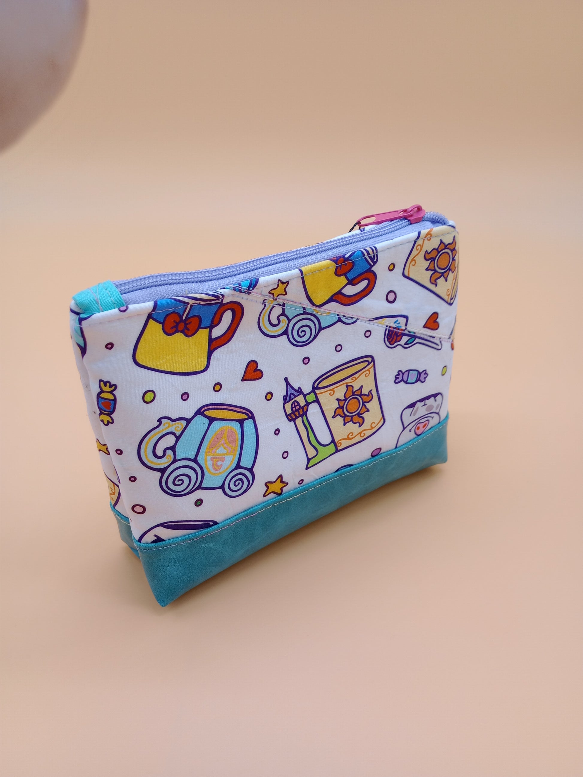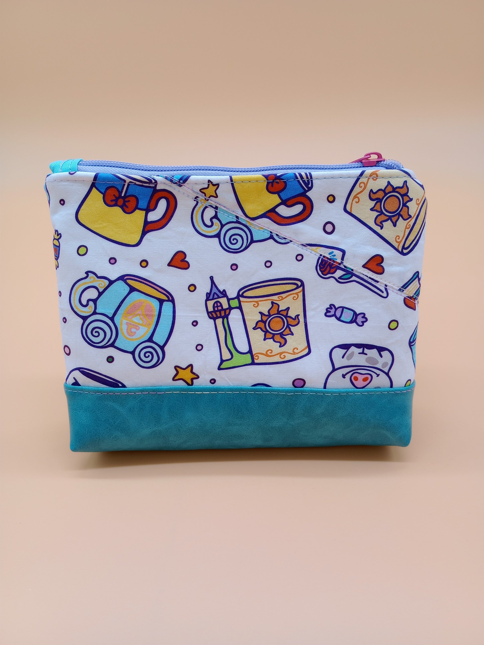 This cute little pouch has many different utilizations. The vinyl bottom gives structure to remain upright while the cotton offers enough flexibility to fit in a wide array of bags. Use it to keep your makeup safe, your office supplies together or your monthly moon supplies close by. A fitted zipper keeps it all securely inside.