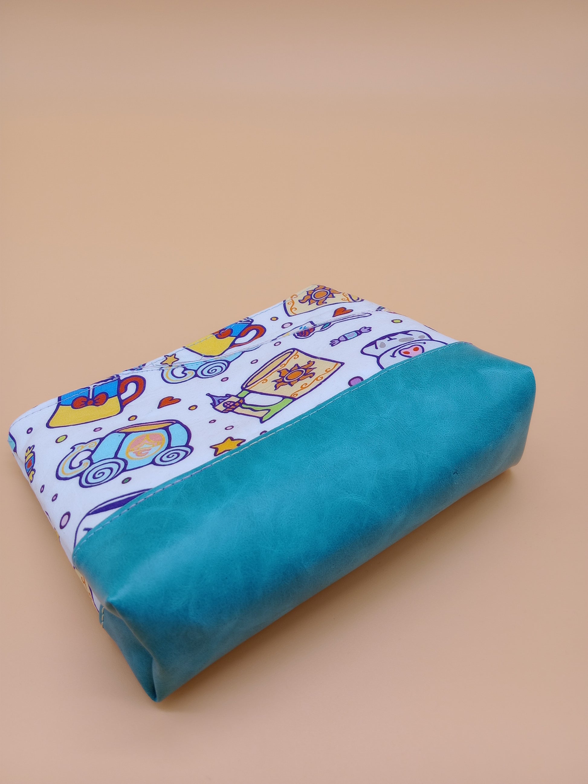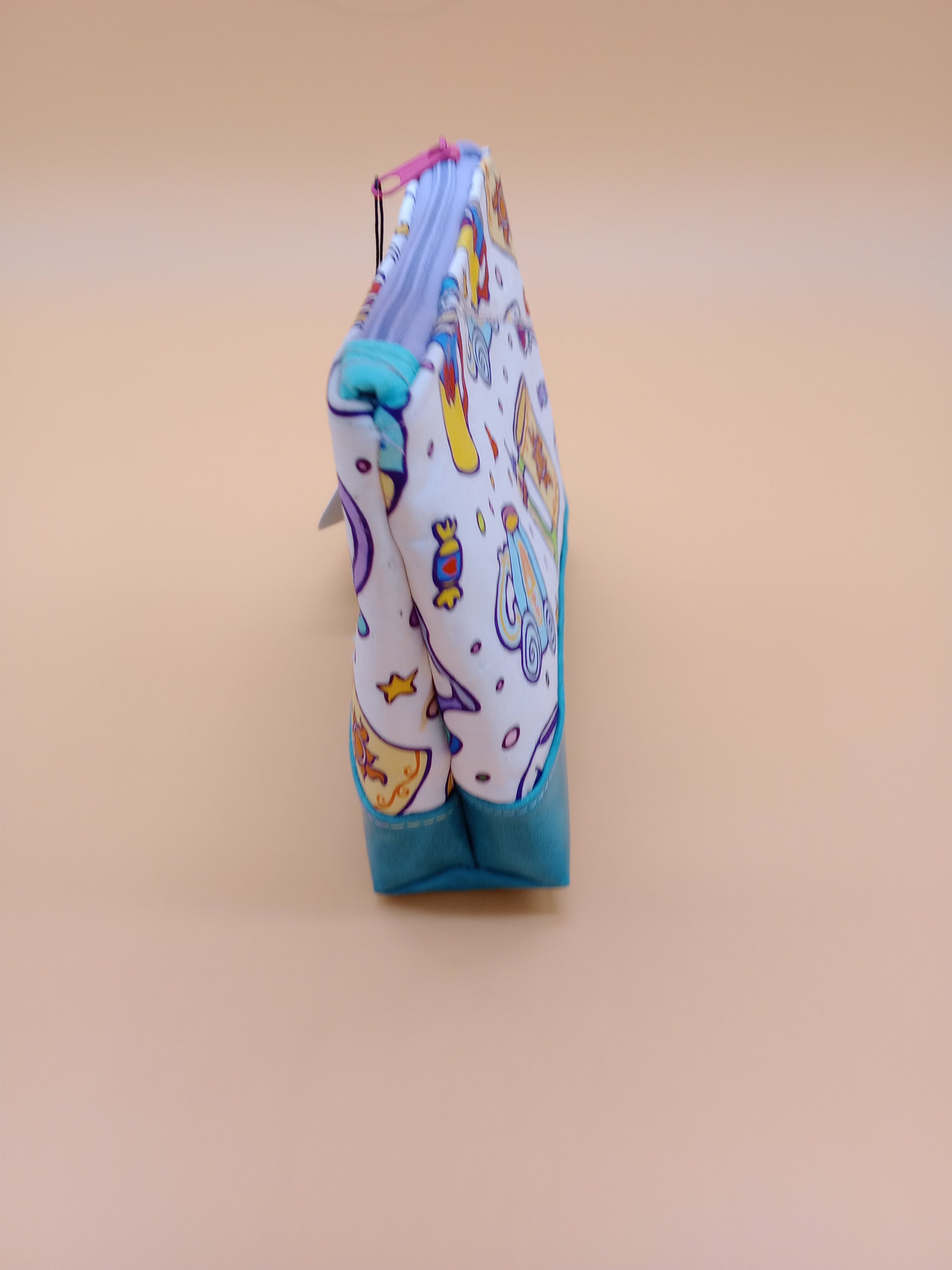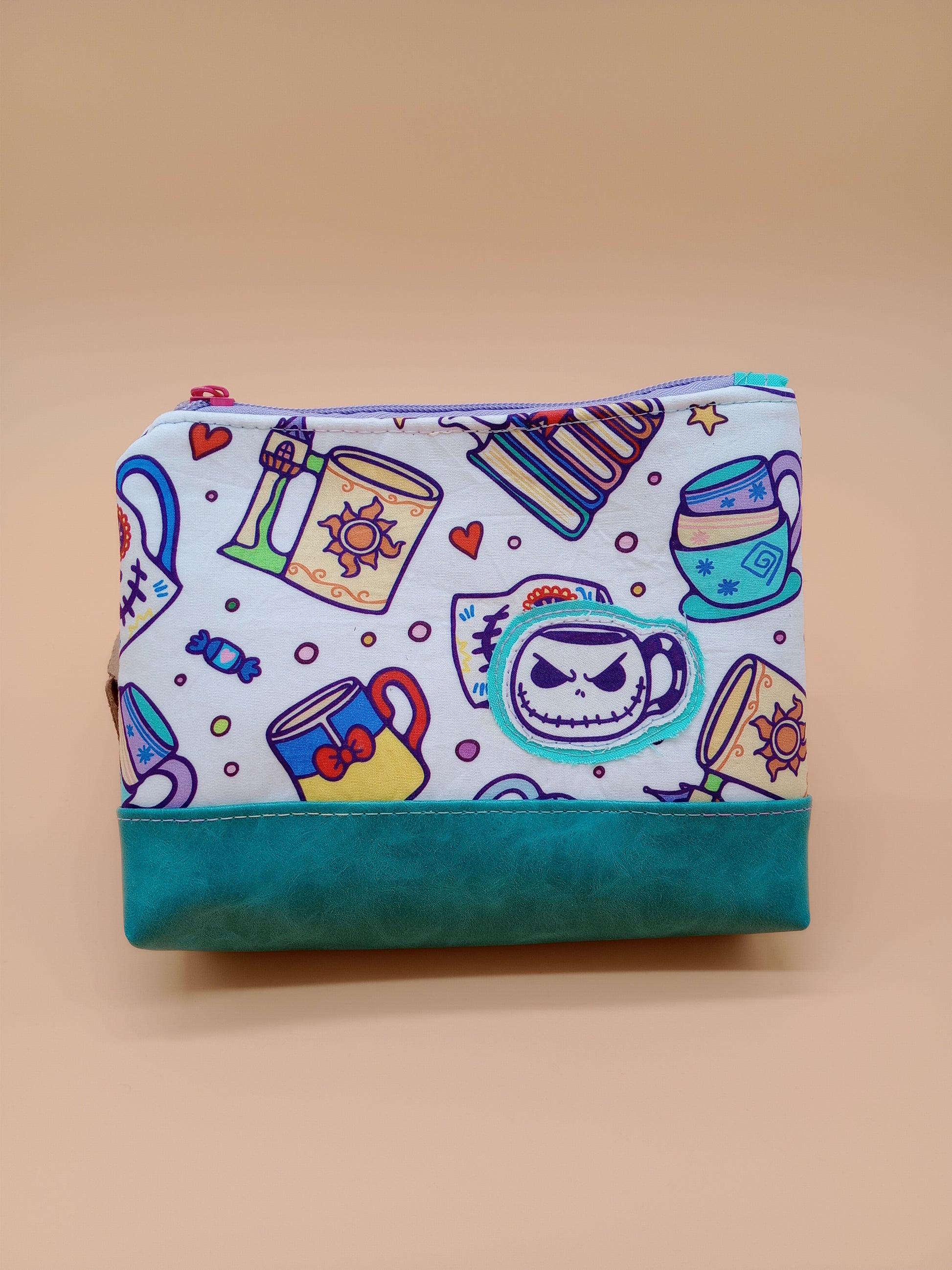 This cute little pouch has many different utilizations. The vinyl bottom gives structure to remain upright while the cotton offers enough flexibility to fit in a wide array of bags. Use it to keep your makeup safe, your office supplies together or your monthly moon supplies close by. A fitted zipper keeps it all securely inside.