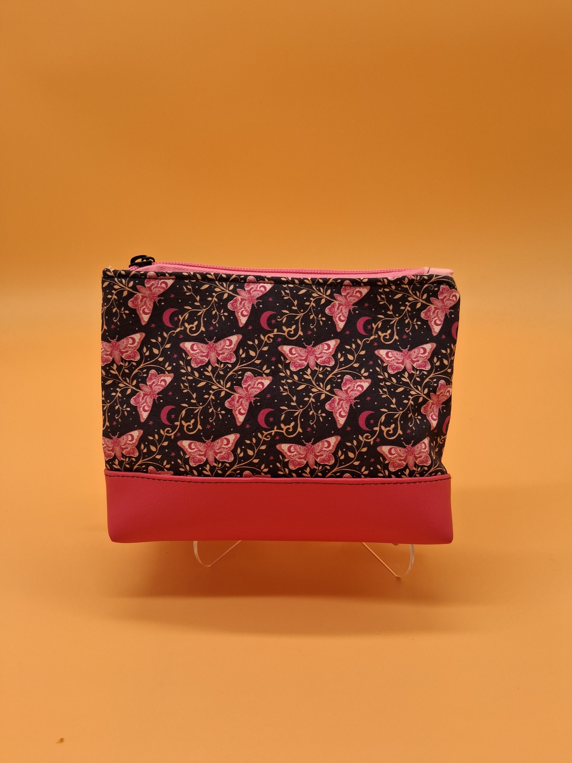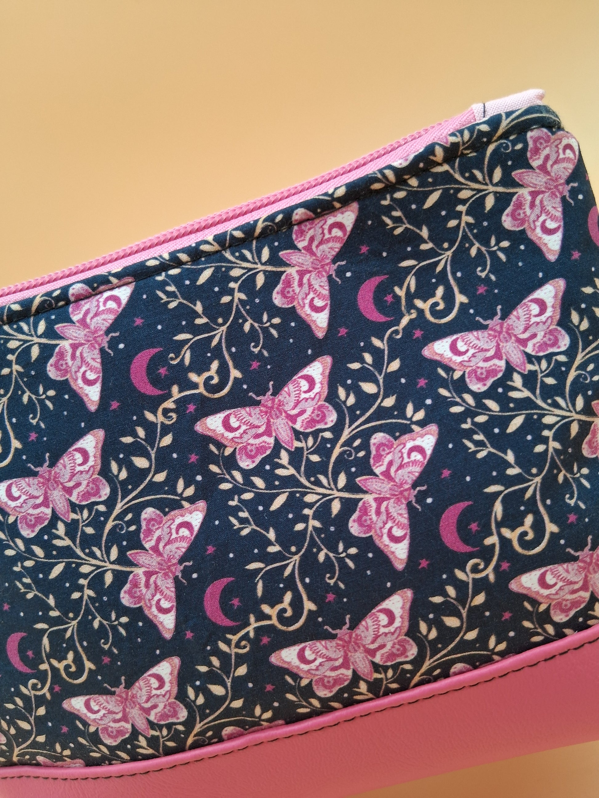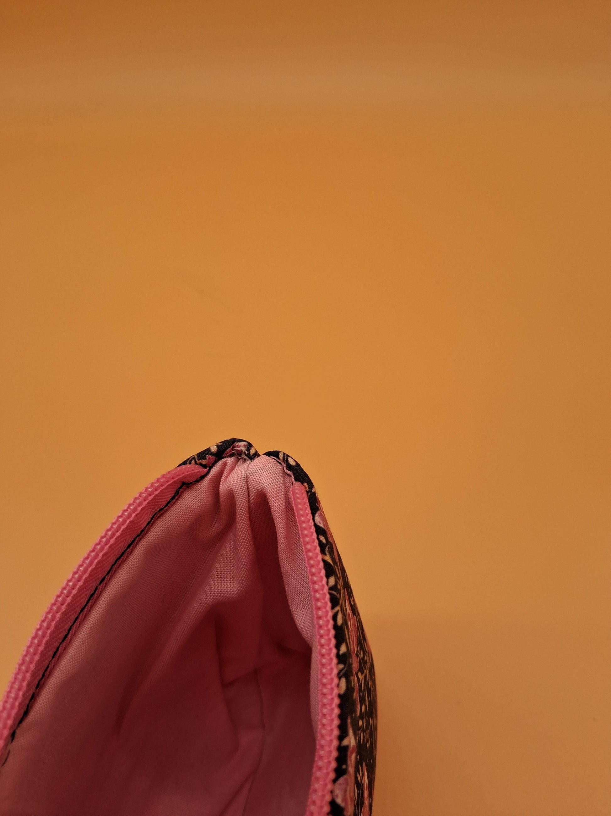 This cute little pouch has many different utilizations. The vinyl bottom gives structure to remain upright while the cotton offers enough flexibility to fit in a wide array of bags. Use it to keep your makeup safe, your office supplies together or your monthly moon supplies close by. A fitted zipper keeps it all securely inside.