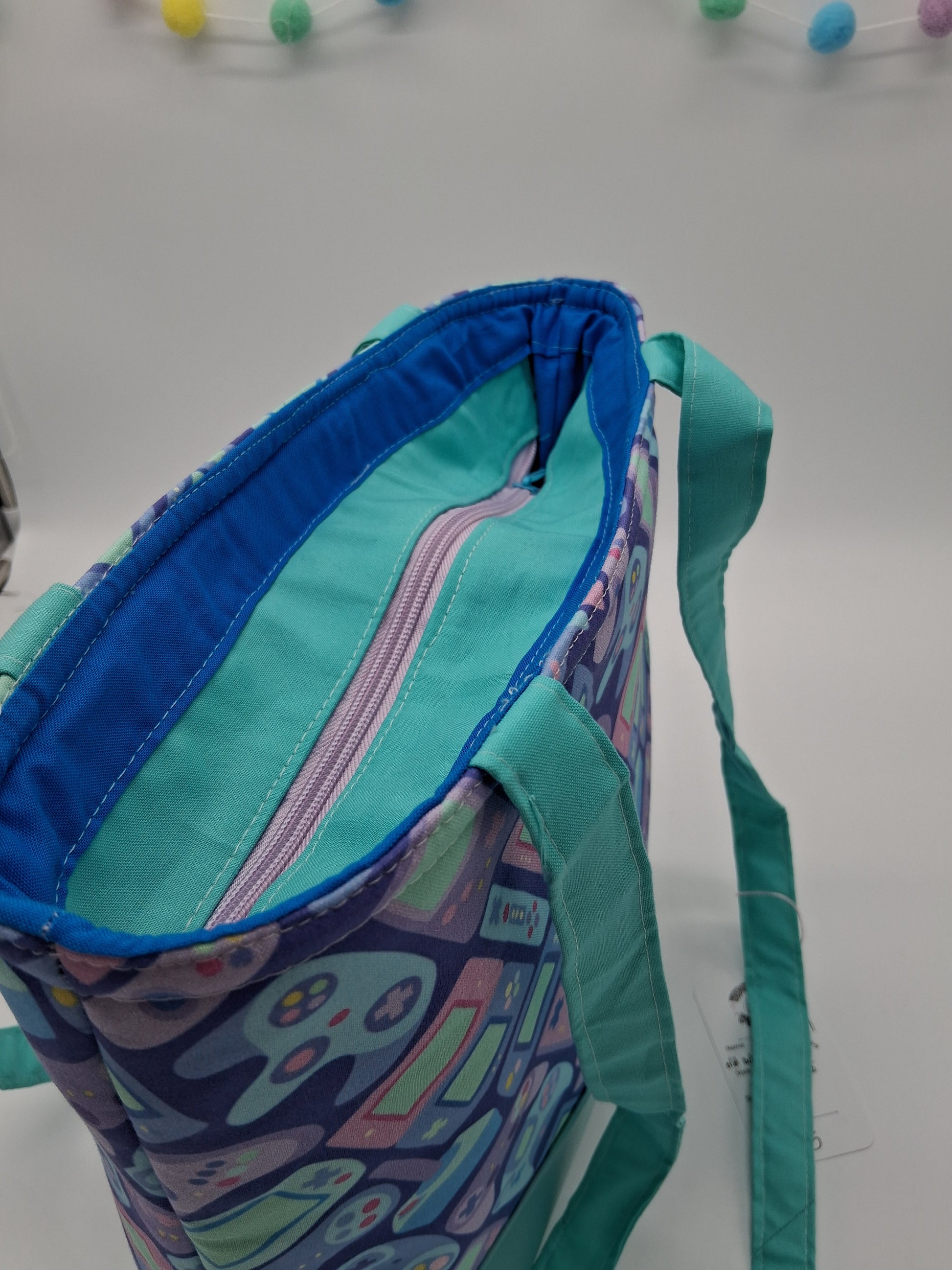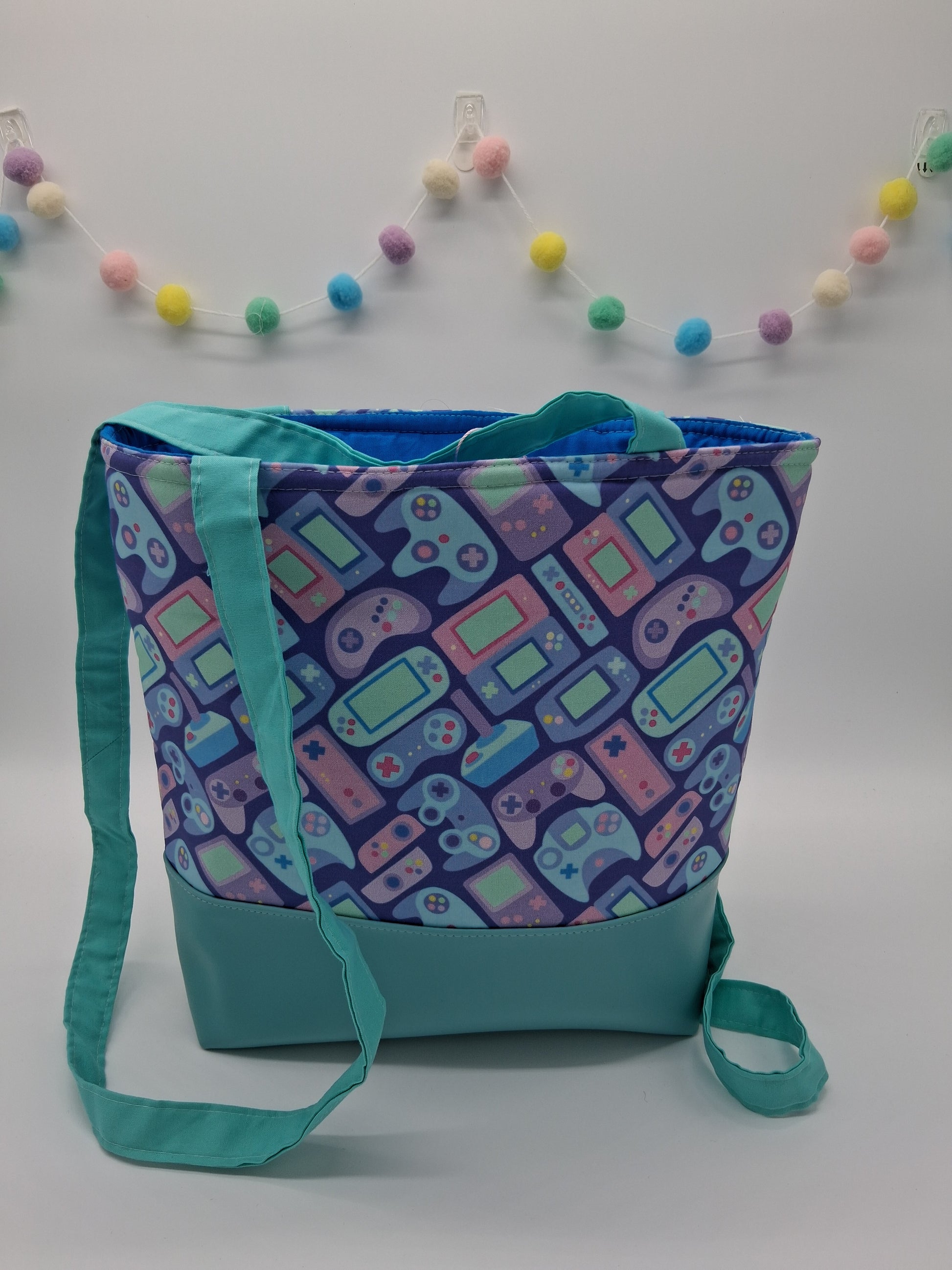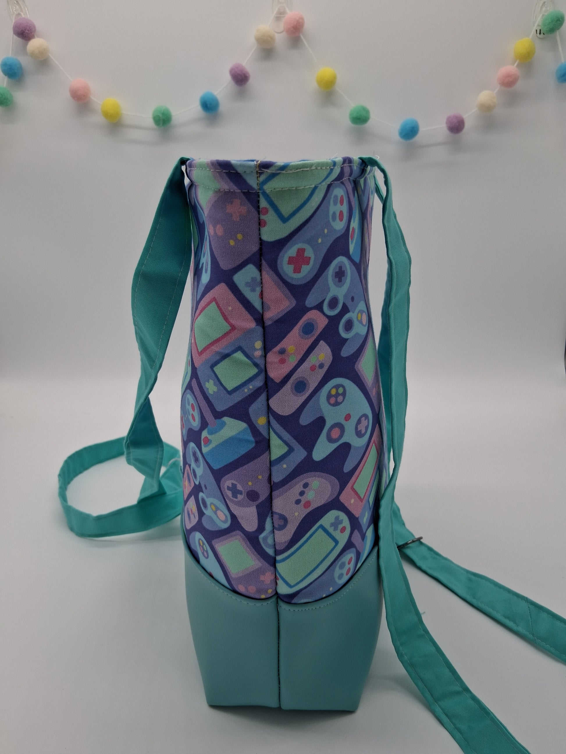 Beautiful custom 100% cotton fabric has been reinforced with soft but sturdy foam and features a vinyl bottom for easy self-standing and wiping clean. The straps are made from coordinated 100% cotton fabric as well as the lining.