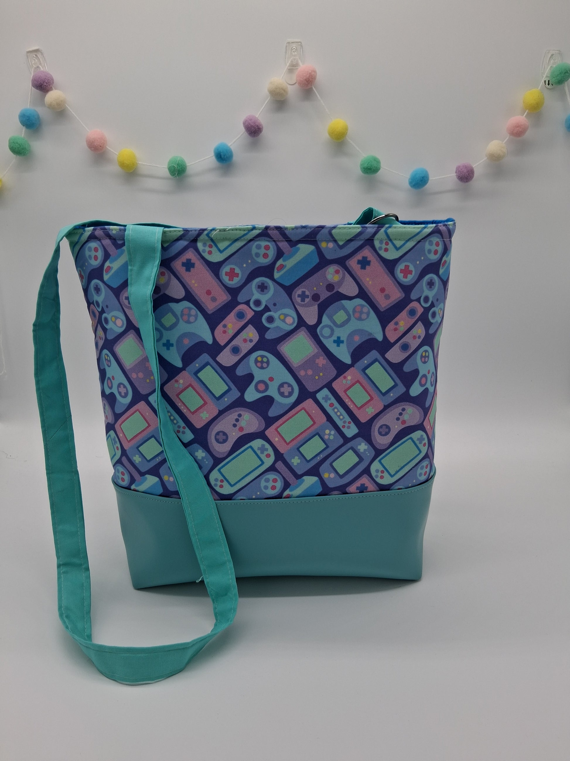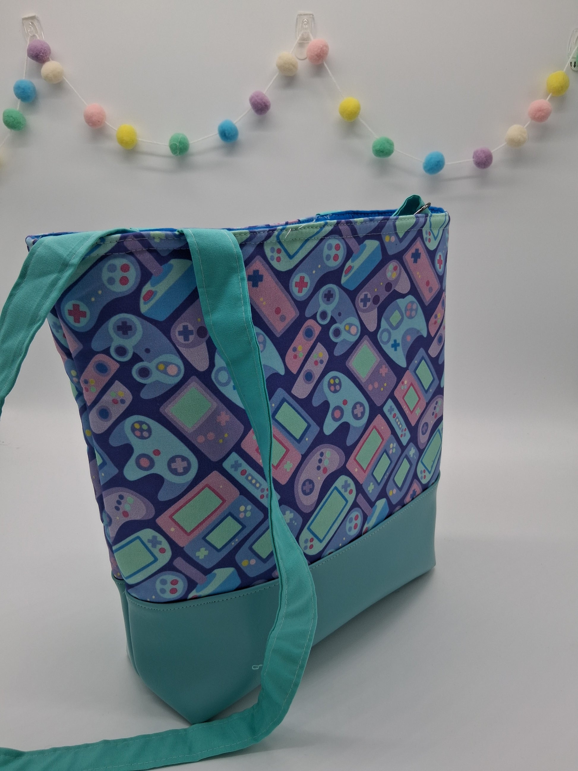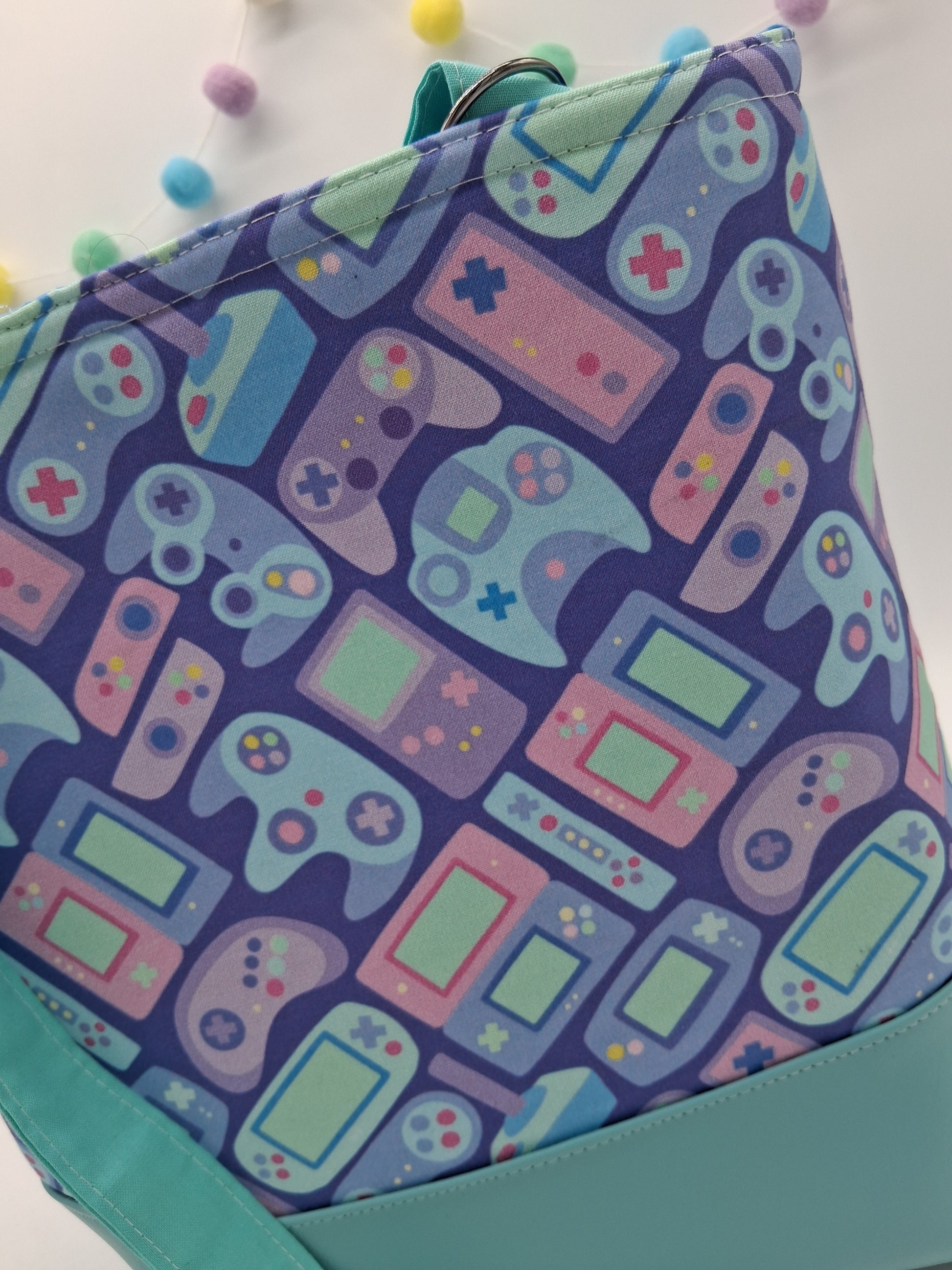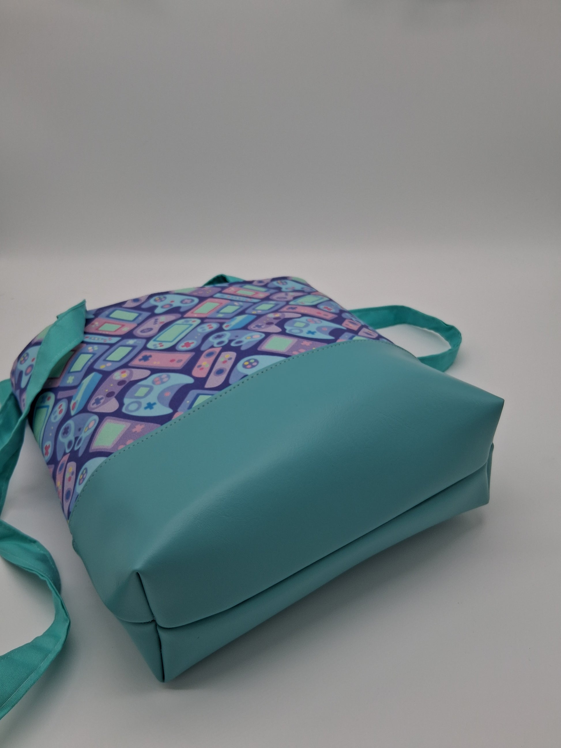 Beautiful custom 100% cotton fabric has been reinforced with soft but sturdy foam and features a vinyl bottom for easy self-standing and wiping clean. The straps are made from coordinated 100% cotton fabric as well as the lining.
