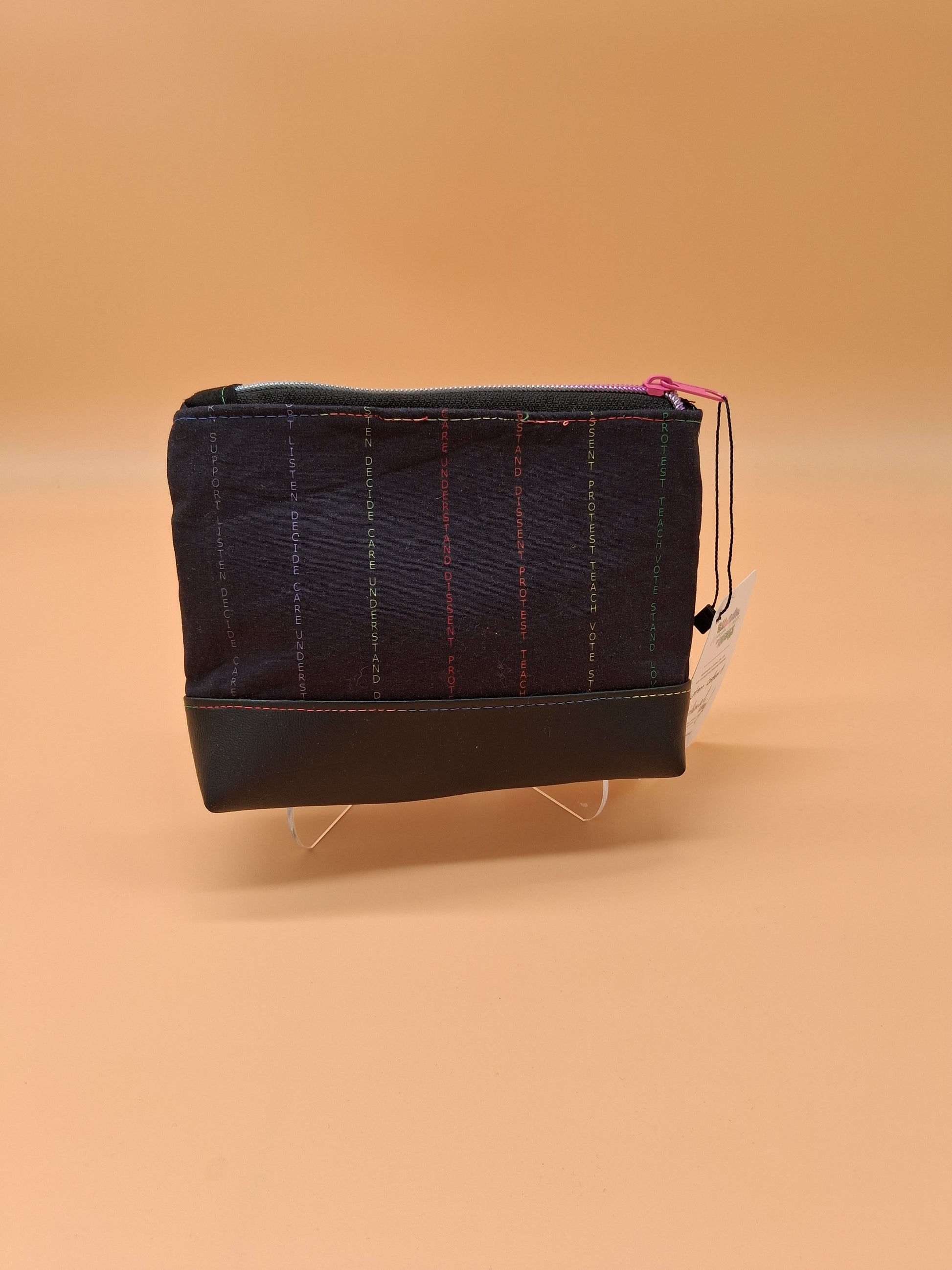 This cute little pouch has many different utilizations. The vinyl bottom gives structure to remain upright while the cotton offers enough flexibility to fit in a wide array of bags. Use it to keep your makeup safe, your office supplies together or your monthly moon supplies close by. A fitted zipper keeps it all securely inside.